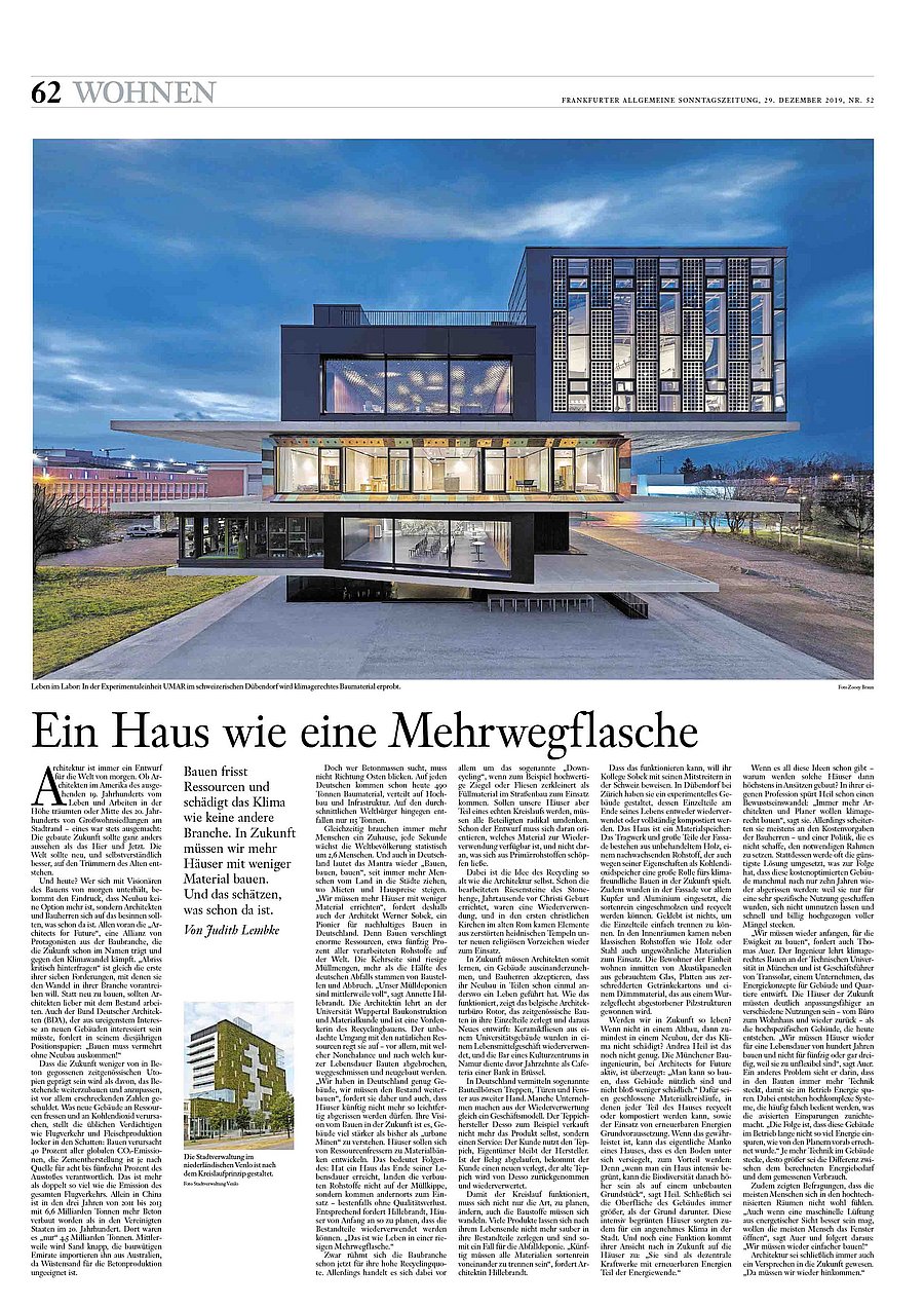 Am 29. Dezember 2019 veröffentlichte die Frankfurter Allgemeine Zeitung in ihrer Sonntagsausgabe den Artikel „Ein Haus wie eine Mehrwegflasche“. Als Interviewpartnerin diente der Autorin Frau Judith Lembke unteranderem Prof. Annette Hillebrandt.