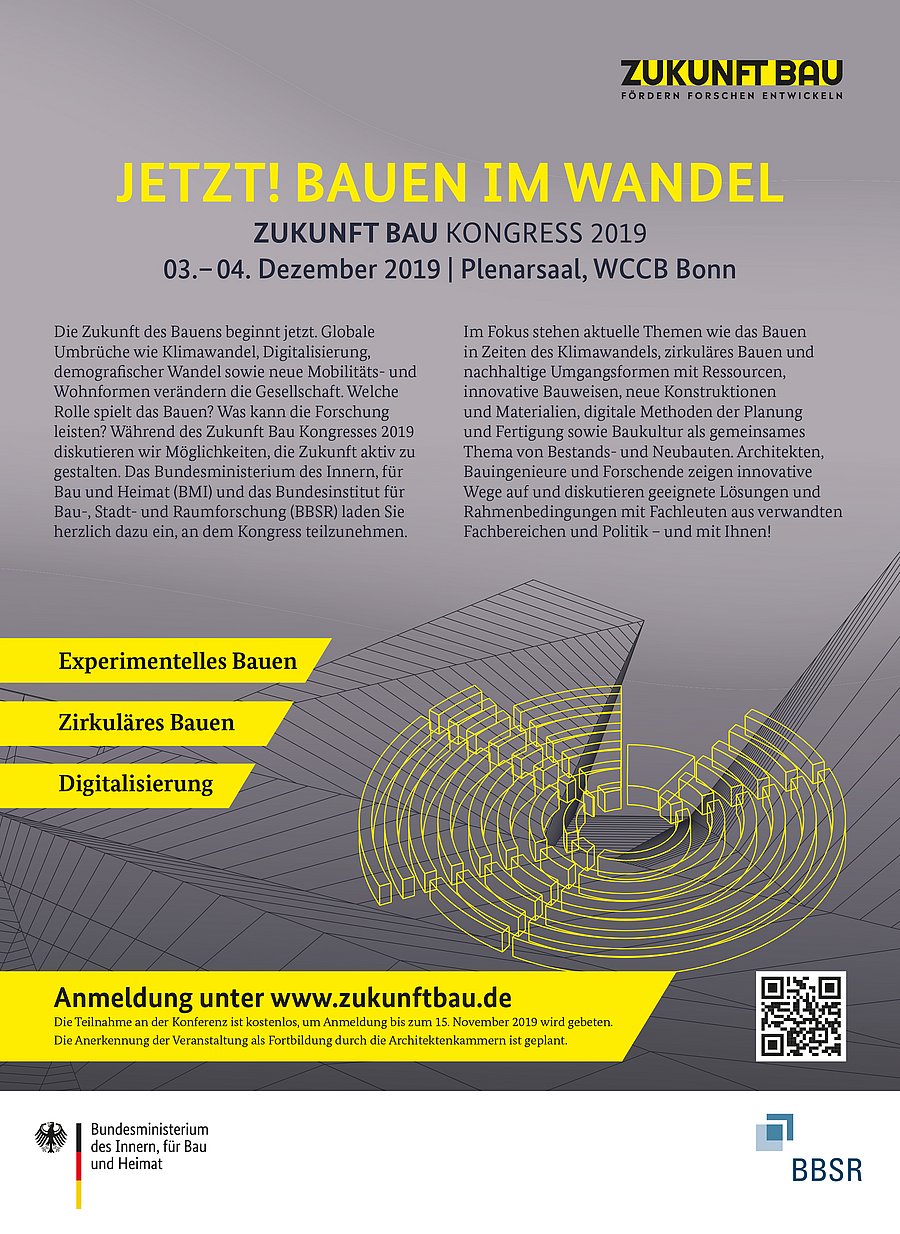 Während des Zukunft Bau Kongresses 2019 diskutieren wir Möglichkeiten, die Zukunft aktiv zu gestalten. Das Bundesministerium des Innern, für Bau und Heimat (BMI) und das Bundesinstitut für Bau-, Stadt- und Raumforschung (BBSR) laden Sie herzlich dazu ein, an dem Kongress teilzunehmen.
